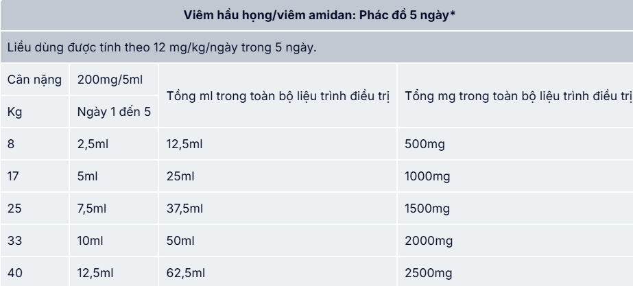 Viêm hầu họng/viêm amidan. Liều Zitromax khuyến nghị cho trẻ em bị viêm hầu họng/viêm amidan là 12mg/kg ngày một lần trong 5 ngày. (Xem bảng dưới đây.)