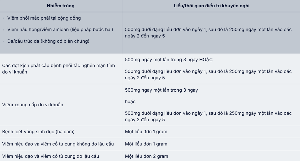 Đối với tất cả các chỉ định khác trong đó sử dụng dạng bào chế dùng qua đường uống, nên dùng tổng liều 1500mg chia thành 500mg mỗi ngày trong 3 ngày. Có thể thay thế bằng cách dùng cùng mức tổng liều này trong 5 ngày với 500mg dùng vào Ngày 1, sau đó là 250mg mỗi ngày vào các Ngày 2 đến Ngày 5.