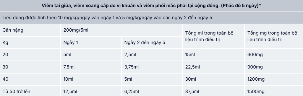 Nên cho dùng tổng liều là 30 mg/kg dưới dạng một liều duy nhất 10 mg/kg mỗi ngày trong 3 ngày, hoặc dùng trong 5 ngày với một liều đơn hàng ngày là 10 mg/kg vào Ngày 1, sau đó là 5 mg/kg vào các ngày 2 - ngày 5.