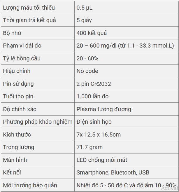 Thông số kỹ thuật máy đo đường huyết Caresens N Premier