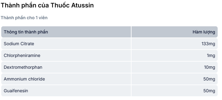 Atussin của Công ty TNHH United International Pharma sản xuất. Thuốc có thành phần chính là Dextromethorphan. Đây là thuốc được dùng để điều trị triệu chứng ho do họng và phế quản bị kích thích khi cảm lạnh thông thường hoặc khi hít phải chất kích thích.
