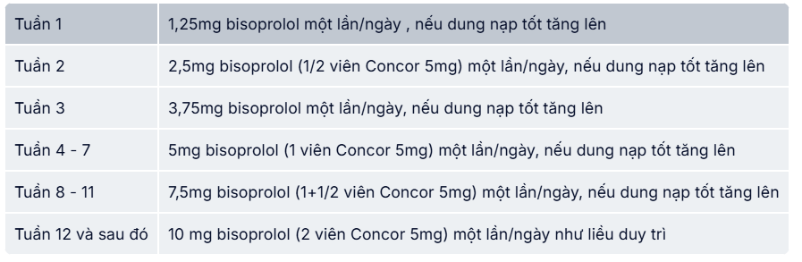 Bác sĩ điều trị cần phải có kinh nghiệm trong điều trị suy tim mãn. Điều trị suy tim mãn ổn định với bisoprolol được khởi đầu theo phác đồ chuẩn dưới đây, đáp ứng của mỗi bệnh nhân có thể tùy thuộc vào cách dung nạp của bệnh nhân đối với mỗi liều, có nghĩa là chỉ tăng liều khi đã dung nạp tốt liều trước đó.