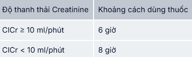 Ở bệnh nhân suy thận nặng, khoảng cách tối thiểu giữa mỗi lần dùng thuốc nên được điều chỉnh theo bảng sau: