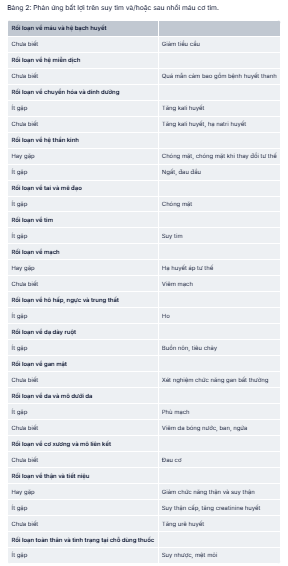 Bảng 2: Phản ứng bất lợi trên suy tim và/hoặc sau nhồi máu cơ tim.
