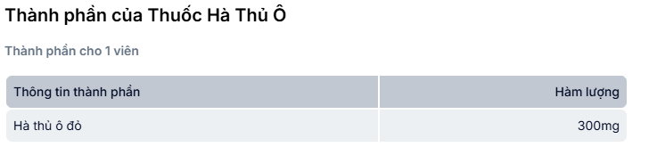 Hà thủ ô Traphaco được bào chế ở dạng viên nén bao đường, mỗi viên nén bao đường 300 mg (tương đương 1,5 g rễ Hà thủ ô đỏ).