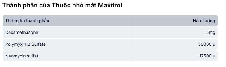 Maxitrol Alcon 5 ml của công ty S.A. Alcon - Couvreur N.V., đây là thuốc được chỉ định để sử dụng trong trường hợp viêm ở mắt khi xét thấy cần dùng đồng thời cả thuốc kháng khuẩn.