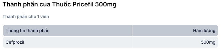 Pricefil 500mg có chứa hoạt chất cefprozil là một kháng sinh cephalosporin thế hệ thứ hai để điều trị nhiễm khuẩn đường hô hấp trên, nhiễm khuẩn đường hô hấp dưới, nhiễm khuẩn da mô mềm, nhiễm khuẩn đường tiết niệu.