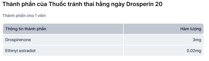 Drosperin 20 thành phần chính drospirenone 3 mg và ethinyl estradiol 20 mcg là thuốc tránh thai dùng hằng ngày, có dạng bào chế viên nén bao phim, mỗi hộp chứa 28 viên gồm: 24 viên hoạt tính (màu đỏ), 4 viên giả dược (màu trắng).
