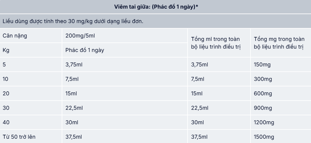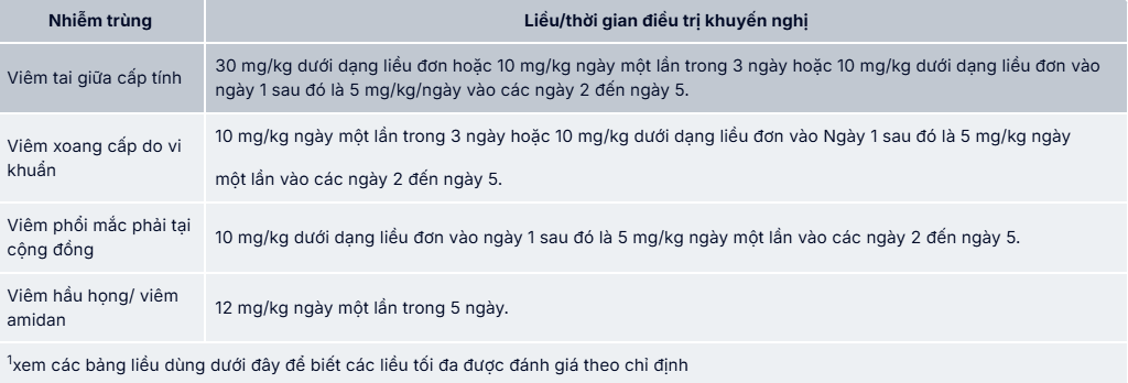 Hướng dẫn liều dùng cho bệnh nhân nhi bị viêm tai giữa, viêm xoang cấp do vi khuẩn và viêm phổi mắc phải tại cộng đồng (Từ 6 tháng tuổi trở lên, (xem Sử dụng ở trẻ em])