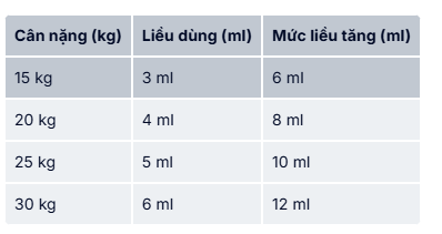 Liều dùng khuyến cáo: Uống một lần mỗi ngày với liều 1ml mỗi 5 kg thể trọng như trong bảng, thời gian tối thiểu 3 - 4 tháng. Có thể tăng gấp đôi liều dùng trong vòng 5 - 10 ngày khi nhu cầu tăng.