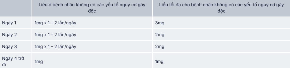 1 mg/ngày. Nên bắt đầu với liều 0,5 mg/ngày và điều chỉnh liều nếu cần tùy theo đáp ứng lâm sàng.