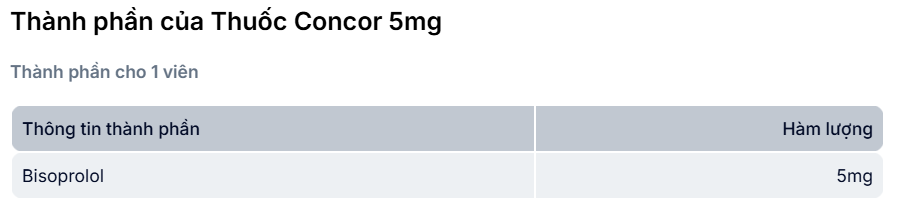 Bisoprolol hoạt chất chính của Concor 5mg, là thuốc chẹn thụ the β1 giao cảm chọn lọc, không có tính ổn định màng và hoạt tính giống giao cảm nội tại. Bisoprolol cho thấy ít có tác dụng trên thụ thể β2 của cơ trơn phế quản và mạch máu cũng như ảnh hưởng trên chuyển hóa liên quan đến thụ thể β2.