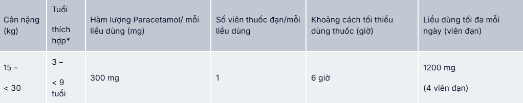 Với trẻ em cân nặng từ 15 đến < 30 kg, tổng liều paracetamol không được vượt quá 60 mg/kg mỗi ngày.