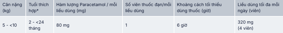 Với trẻ em cân nặng dưới 10 kg. Tổng liều paracetamol không được vượt quá 60 mg/kg mỗi ngày.