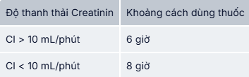 Ở bệnh nhân suy thận nặng, khoảng cách tối thiểu giữa hai lần dùng thuốc nên được điều chỉnh theo bảng sau: