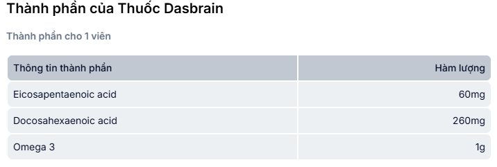Dasbrain được bào chế ở dạng viên nang mềm. Lọ chứa 30 viên nang mềm. Mỗi viên chứa 1 g dầu cá ngừ tự nhiên tương đương eicosapentaenoic acid (EPA) 60 mg, docosahexaenoic acid (DHA) 260 mg, omega - 3 marine triglycerides 320 mg.