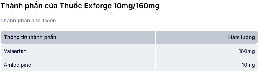Thuốc Exforge 10/160 do NOVARTIS FARMACEUTICA S.A sản xuất dạng viên uống phối hợp có thành phần là Amlodipin besylate, Valsartan có tác dụng điều trị tăng huyết áp vô căn.