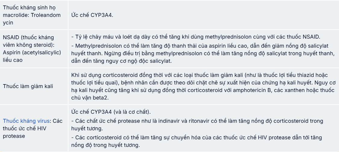Bảng 1 bao gồm những tương tác thuốc phổ biến hoặc quan trọng về mặt lâm sàng với methylprednisolon.