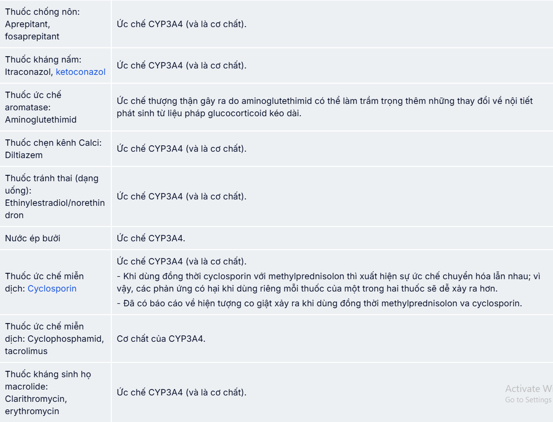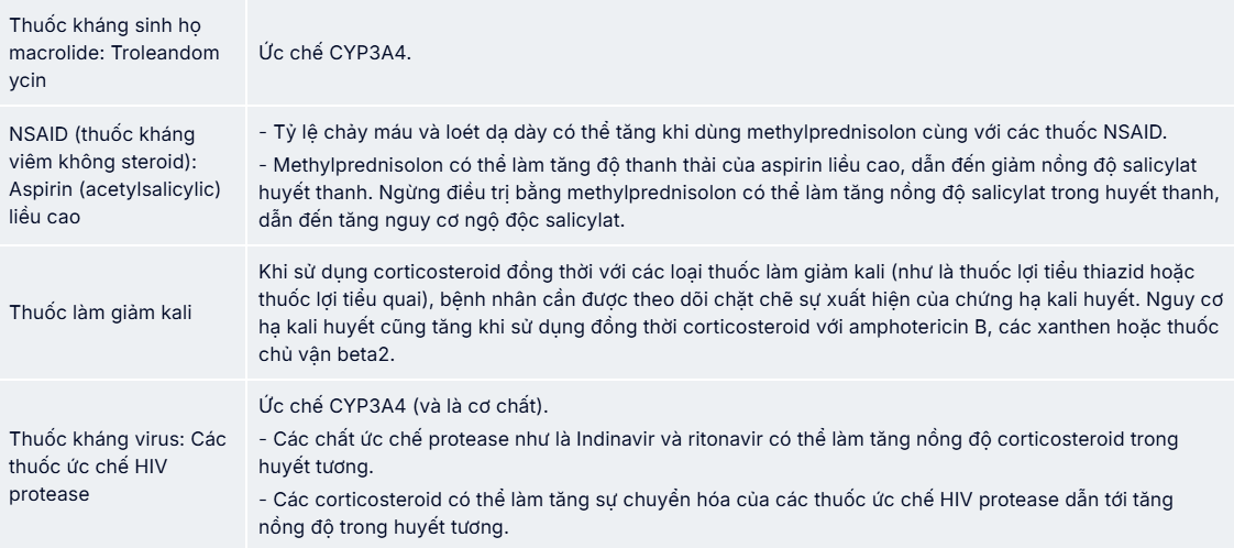 Những thuốc không có hiệu ứng qua trung gian CYP 3A4: Các tương tác và ảnh hưởng khác xảy ra với methylprednisolon được trình bày trong bảng 1.