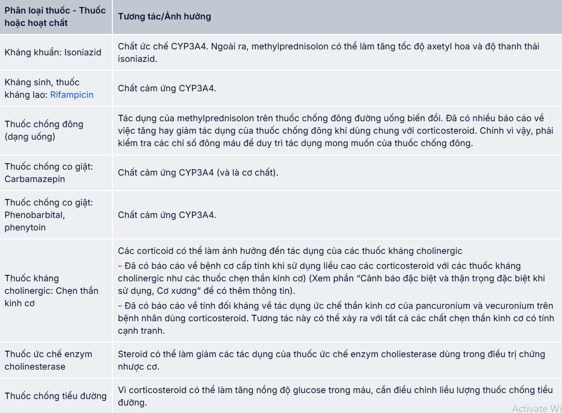 Bảng 1 bao gồm những tương tác thuốc phổ biến hoặc quan trọng về mặt lâm sàng với methylprednisolon.