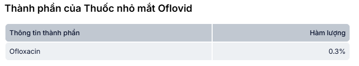 Thuốc nhỏ mắt Oflovid 0.3% được sản xuất bởi công ty Santen Pharmaceutical Co., Ltd, thành phần chính là ofloxacin, được dùng để điều trị các bệnh: Viêm bờ mi, viêm túi lệ, lẹo (chắp), viêm kết mạc, viêm sụn mi, viêm giác mạc (kể cả loét giác mạc) do nhiễm khuẩn nhạy cảm và dùng làm kháng sinh dự phòng sử dụng trước và sau phẫu thuật mắt.
