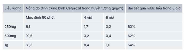 Sau khi uống lúc no hoặc đói, Pricefil 500mg đều hấp thu tốt. Sinh khả dụng (tuyệt đối) của Pricefil 500mg khi uống là 90%. Các thông số dược động học của thuốc không bị ảnh hưởng khi dùng thuốc lúc no hoặc dùng đồng thời với các thuốc kháng acid. Nồng độ đỉnh trung bình trong huyết tương sau khi dùng Cefprozil cho bệnh nhân lúc đói được trình bày trong bảng dưới đây. Khoảng 65% liều dùng được bài tiết không đổi trong nước tiểu.
