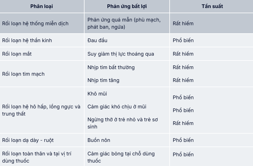 Phản ứng bất lợi được liệt kê dưới đây, phân loại bởi hệ thống cơ quan và tần suất. Tần suất được định nghĩa như sau: Rất phổ biến (≥ 1/10), phổ biến (≥ 1/100 đến <1/10), không phổ biến (≥ 1/1.000 đến <1/100), hiếm gặp (≥ 1/10.000 đến <1/1.000), rất hiếm (<1/10.000).