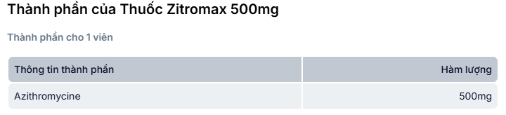 Zithromax 500mg của Pfizer Italia S.R.L, thành phần chính Azithromycin, được chỉ định để điều trị những nhiễm khuẩn gây ra bởi vi khuẩn nhạy cảm; trong nhiễm khuẩn đường hô hấp dưới, trong nhiễm khuẩn răng miệng, trong nhiễm khuẩn da và mô mềm, trong viêm tai giữa cấp tính và trong nhiễm khuẩn đường hô hấp trên, nhiễm khuẩn sinh dục, nhiễm khuẩn cơ hội thường gặp ở những bệnh nhân nhiễm virus gây suy giảm miễn dịch ở người. Thuốc được bào chế dưới dạng viên nén 500mg.
