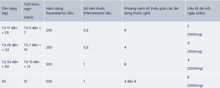 Liều dùng phải được tính theo cân nặng của trẻ. Tuổi thích hợp tương ứng với cân nặng được trình bày bên dưới chỉ để tham khảo. Để tránh nguy cơ quá liều, cần kiểm tra và xác nhận các thuốc dùng kèm (bao gồm cả thuốc kê đơn và không kê đơn) không chứa paracetamol. Dạng thuốc này chỉ dùng cho người lớn và trẻ em có cân nặng trên 17kg (khoảng 5 tuổi trở lên).