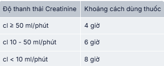 Ở bệnh nhân suy thận nặng, khoảng cách tối thiểu giữa mỗi lần dùng thuốc nên được điều chỉnh theo bảng sau: